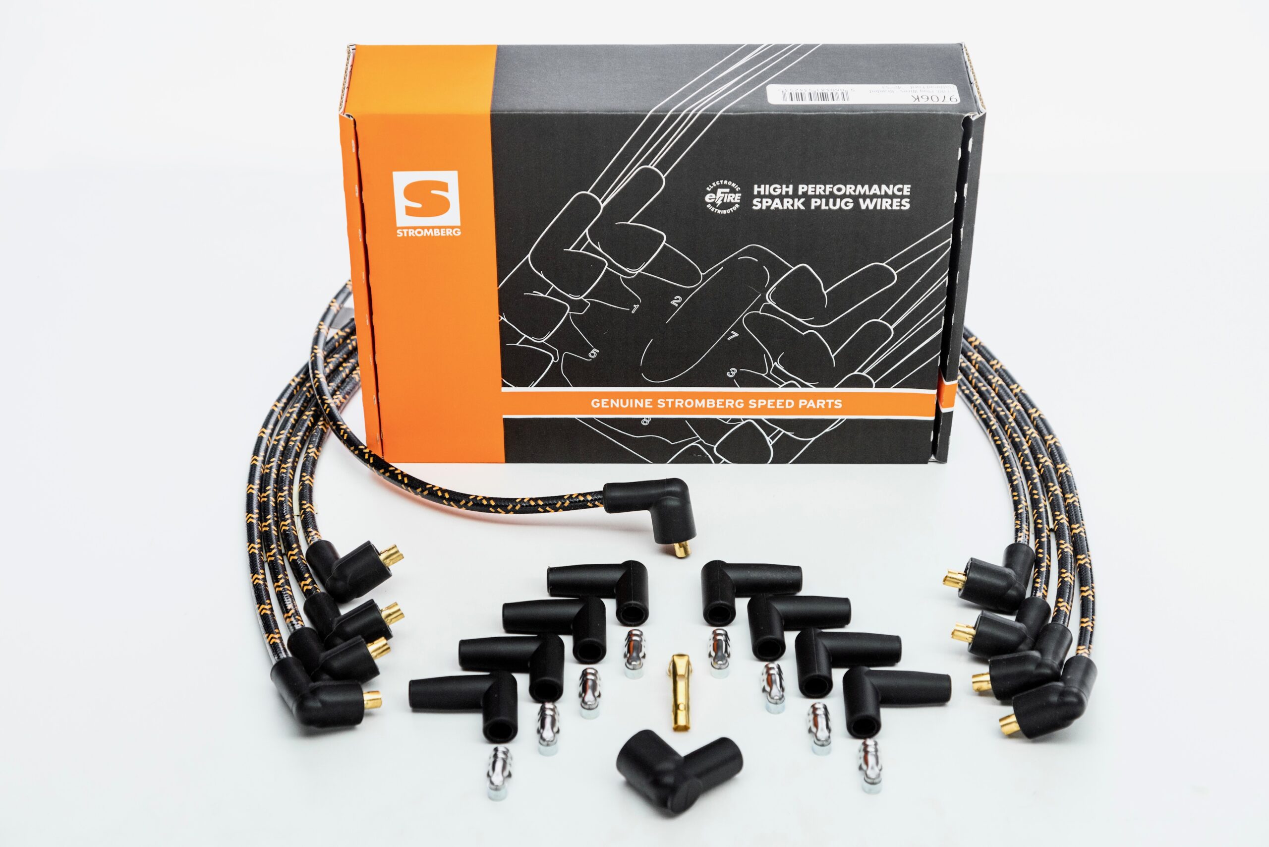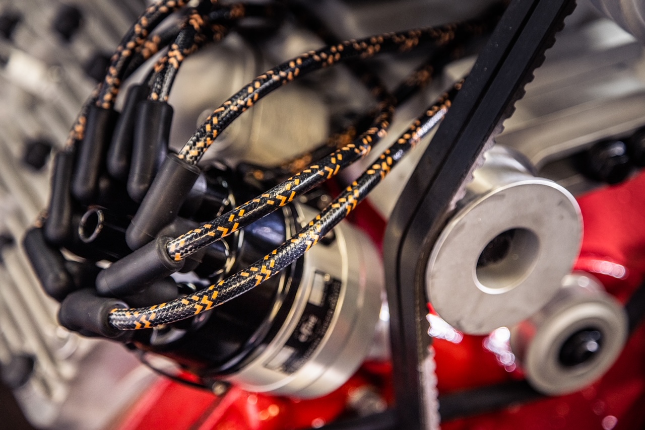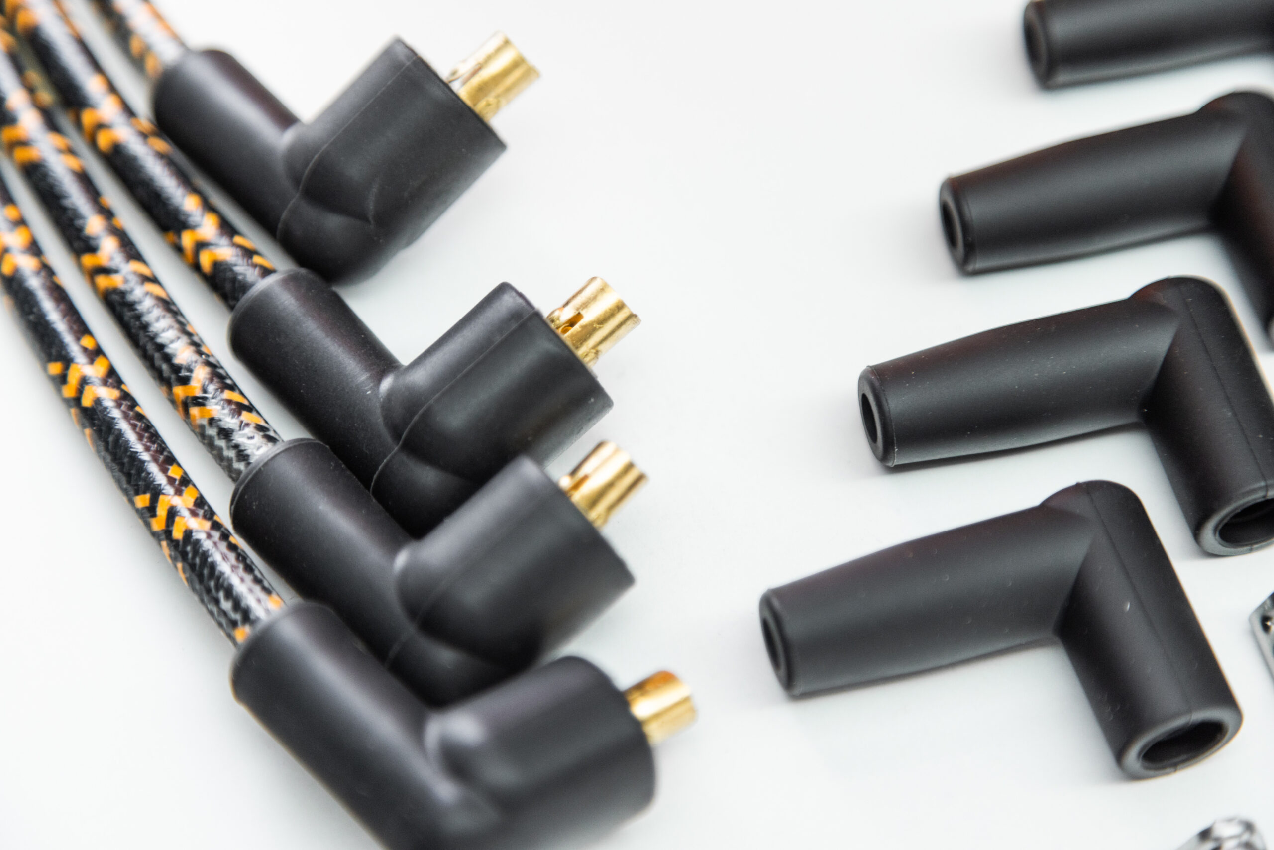 The perfect high energy plug wire kit for Ford Flathead V8 engines - front mount 21A ‘crab caps’ and later 8BA distributors. Cotton braided in traditional black with Stromberg orange tracer.
